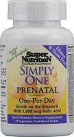 Simply OnePreNatal is designed to support your overall health and well-being and give you the best possible nutritional support for your baby’s health. It provides the most generous potency of vitamins essential minerals and anti-oxidants in any prenatal one-per-day vitamin. It supplies 225 mcg of Chromium 210 mg of Calcium 120 IU of Vitamin E 150 mg of Vitamin C 10000 IU of Beta-Carotene 225 mcg of Selenium and the entire vitamin B-Complex. To help reduce birth defects and for healthy bones Simply One Prenatal gives you a full 1000 mcg of Folic Acid 500 IU of Vitamin A 150 mcg of Vitamin B-12 aND 35 mg of Vitamin B-6. For healthy brain and eye development Simply One Prenatal contains 100 mg of Taurine. The papaya and greenfoods blend in Simply One PreNatal combined with added natural vegetable fiber ensure more rapid tablet disintegration so that it is gentle on the stomach. Compare Simply One PreNatal and you'll see that there is no better one-per-day prenatal multi-vitamin. Why a One-Per-Day? SuperNutrition offers a full range of optimal potency multi-vitamins in four to eight tablets per day. However many people want to take only one good multi-vitamin tablet per day. So w